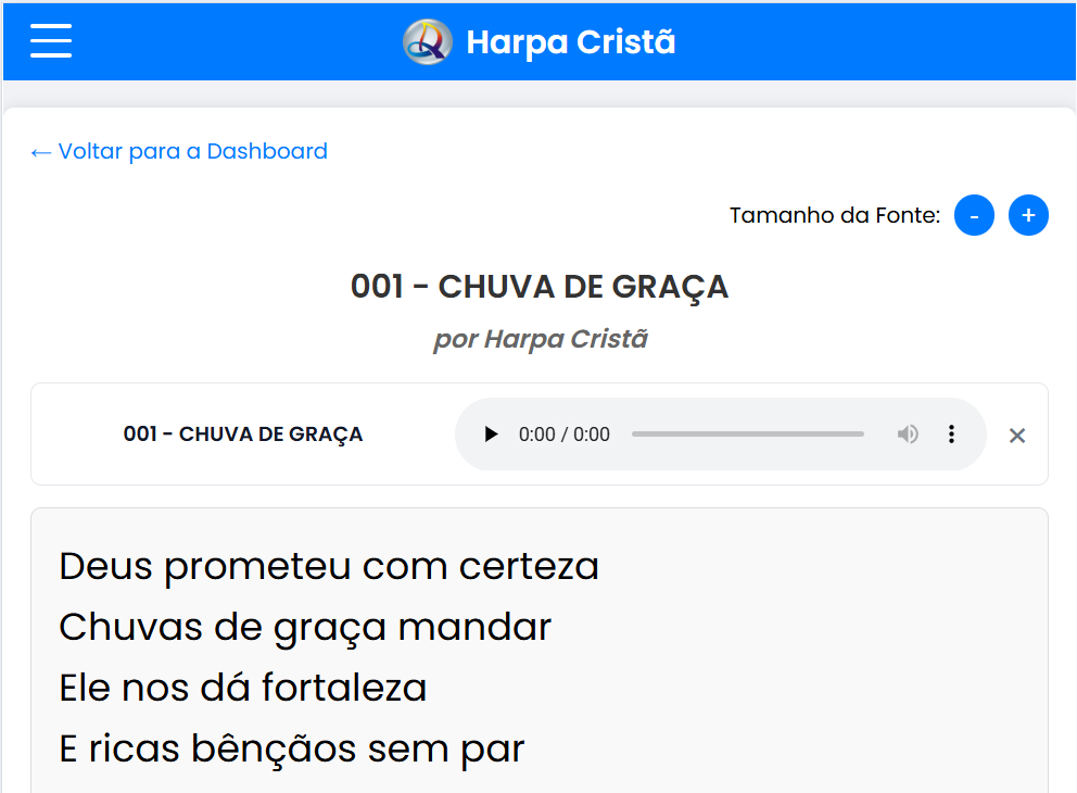 Aqui temos uma bíblia com três traduções disponíveis, devocional diário, visual elegante e acessivel, controle do tamanho das fontes do texto bíblico, pesquisa por qualquer termo. Todos os textos estão hospedados diretamente em um banco de dados próprio sem dependência de terceiros. Todos este projetos contam com banco de dados própio configurado com senha de acesso e níveis de segurança. Este também conta com interligação com os outros dois projetos do player de canções e Letras da Harpa Cristã. Link: Harpa Cristã